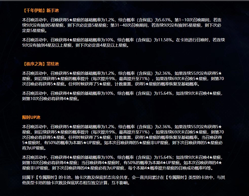 本召唤活动中,召唤获得5★星痕的基础概率为1.2%,综合概率(含保底)为5.63%。第1~10次召唤期间,若连续9次没有抽到5星星痕,则下次必定是5星星痕;第31~40次召唤期间,若连续9次没有抽到5星星痕,则下次必定是5星星痕。