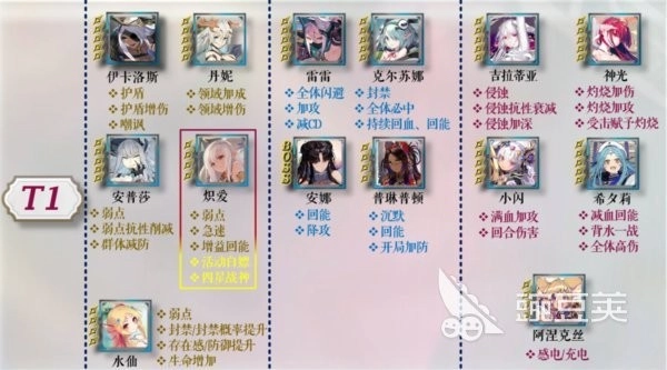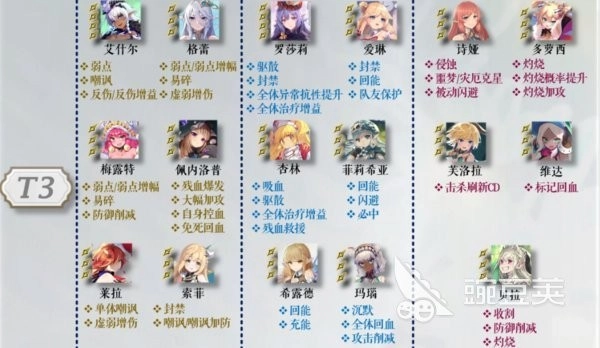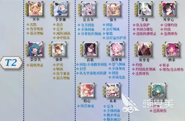T2级别的星痕数量相对更多,包括波斯菊、奈奈芙、仙蒂、未来、希杏林、佩内洛普、多萝西、焰心等,其中未来特别适合新手。这个角色很适合新手在开荒前使用,尽管它的各项能力可能比较均衡,但在前期能发挥较大作用。