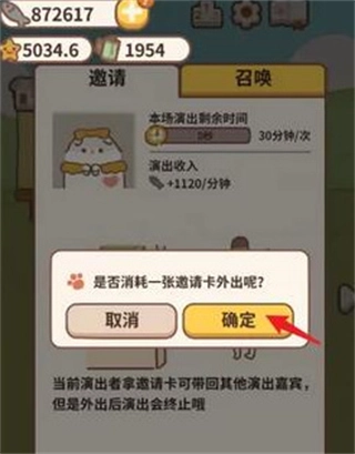4、玩家需要消费1张邀请券,才能邀请小猫咪外出,而且玩家还可以带回新的表演者,邀请是有时间限制的30分钟一次;