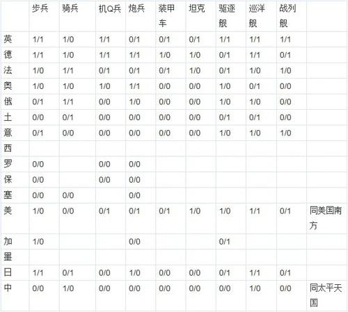 在《世界征服者1945》和《欧陆战争2》里,不同国家的部队能力本就存在差异,所以《欧陆战争3》只是延续了这一设定。但不太方便的是,这次各国的独特能力没在主界面展示,得在战斗过程中才能发现——这对我这种从不看战斗画面的人来说实在头疼……只好硬着头皮整理了一些重要国家的信息,后续还会把空缺的部分补充完整。
