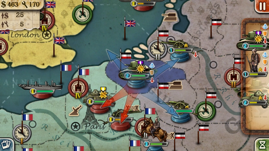 坦克:作为军队里的超级武器,坦克具备极高的攻击力与生命值,消灭一个单位后还能继续发起攻击,并且不受战壕阻挡,同时拥有反击大炮的能力。不过它也存在唯一的缺点,那就是造价十分高昂。坦克的移动力为2,只能在第三级工业区进行生产。