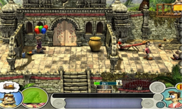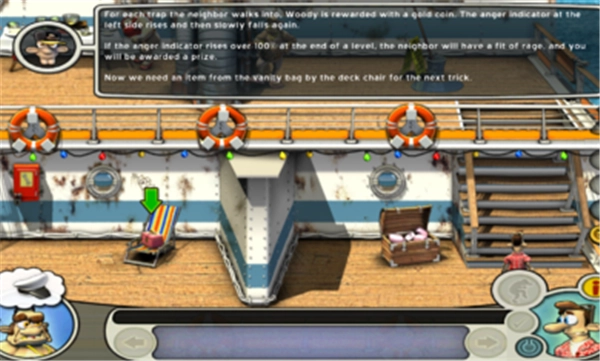 这关难度不大,先按照提示取热水袋,同时把右边箱子里的橡皮筋也拿上。接着上去按提示放置热水袋,躲进烟囱里。等老头被他母亲打屁股后,去左上角,捡起玩具兔和带虱子的毛巾,再从左上角的工具箱里拿万能胶。等老头离开左下角,就去那里,给楼梯旁的标枪套上橡皮筋,把玩具兔放在架子旁边的玩具箱上。之后去右下角,用带虱子的毛巾。等老头离开右上角,立刻上去,往放爆竹的箱子上涂万能胶,然后马上下去或者躲进烟囱里。