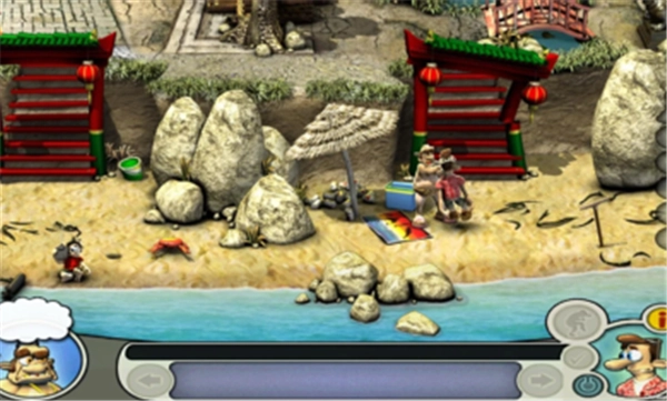 等所有物品都准备好,老头跳水之后,先去跳板那里,用弹簧把老头弹到右下角;接着去右上角,在大象旁边放下装满水的水桶;然后老头会到左下角,再去右下角,在海螺上用螃蟹,之后再夹一只螃蟹;接下来去左下角,把螃蟹放在小孩的城堡那里,把海胆放在毯子上;再去左上角,在遮阳篷的架子旁边用摩托脚踏收起棚子,然后回到跳板旁拿回弹簧重新装上;最后去右上角看结果就行啦~