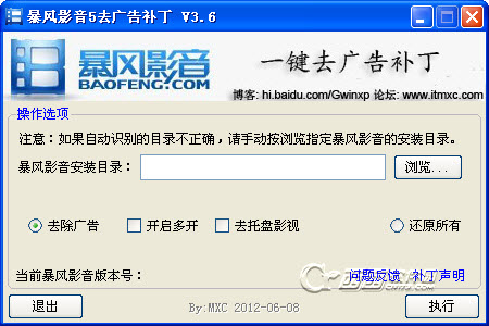 暴风影音的新版发布了,不少朋友还是提醒我更新补丁,呵呵。虽然以前的去广告依旧有效,但新补丁很早就在做了,今天抽时间完善了一下代码,对于暴风的改进重新完善了一下。