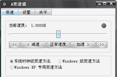 A变速器(A Speeder)]是目前最稳定可靠的Windows变速器,使用它您可以调节windows的系统速度以及所有Windows应用软件(包括各种游戏软件,比如帝国时代,极品飞车等,以及各种网络游戏)的运行速度,在任何环境中都可以使用热键操作,立即调节到您需要的速度。提供多种变速方法,系统时钟级变速对系统进行全面变速,可以避开绝大多数程序对变速器的检测,也具有更好的兼容性;Windows级变速只针对应用程序变速,一般在系统时钟级变速无效时使用。