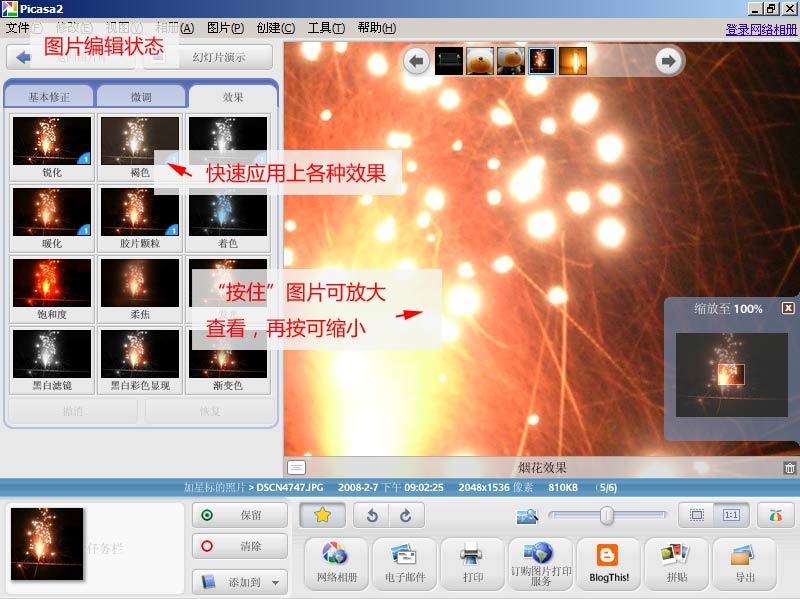 Picasa 的基本修正就是使用一些按钮,快速轻松完成这些工作:裁减、消除红眼、修正对比度和颜色以及增强您的数码照片的效果。