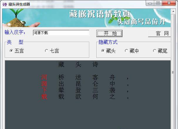 特点:只需输入几个汉字 ,系统就可以自动生成具有唐诗风格的藏头诗。可以用来做姓名藏头诗、爱情藏头诗、祝福藏头诗等等