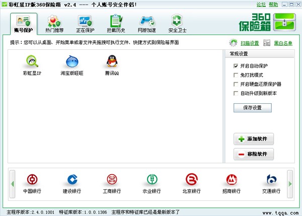 360保险箱是一款提供主动防御功能的产品。在保险箱中,用户运行软件等一系列操作处于安全模式之下,有效防止用户账号或密码被盗取。用户在保险箱中运行网游、QQ、网银等软件时,防止木马等危险进程对目标程序的信息剽窃; 用户使用电脑中的其他软件时,不会受到该产品的干扰。
