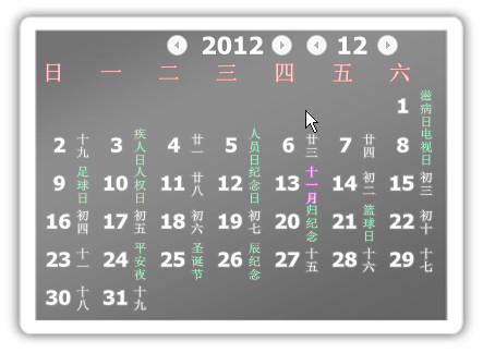 是一款专业的多功能的日历软件,界面美观、简洁,功能实用。具有日期时间显示、农历万年历,壁纸切换,节日查询提醒,备忘录,半透明,且支持镶嵌在桌面上(按“显示桌面”按钮也无法吃掉她),不影响其它操作。九九桌面日历并可以设定在桌面任何位置。