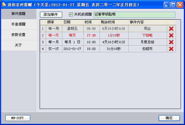 设定时间间隔循环提醒(休息提醒),指定时间提醒(事件提醒)。 特别适合平均每天使用电脑三小时一时的用户
