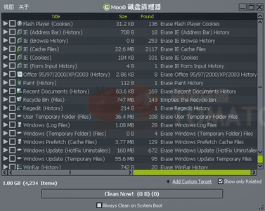 Moo0 DiskCleaner,您可以轻松地清理您硬盘的任何数据。这是非常容易使用,而且你只需要检查的项目要清理,并按下“清除”按钮.