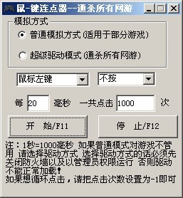 鼠键连点器此鼠键点击器 通杀所有网络游戏 测试过的游戏有:魔兽世界,魔域,诛仙,问道,传奇,飘邈之旅,天龙八部2,冒险岛,天下贰,传奇,大话西游,龙之谷,大龙明权,永恒之塔,赤壁,完美时空,联众世界,征途 ,大唐无双, 英雄之门, 三国群英传2,刀剑英雄2,劲舞团.....................