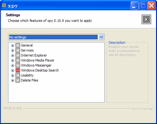 xpy is a small tool which disables the default threats of a Windows XP installation. Besides the classic antispy features, it closes recent security holes like the remote procure call (rpc) service and the distributed component object model (dcom).
