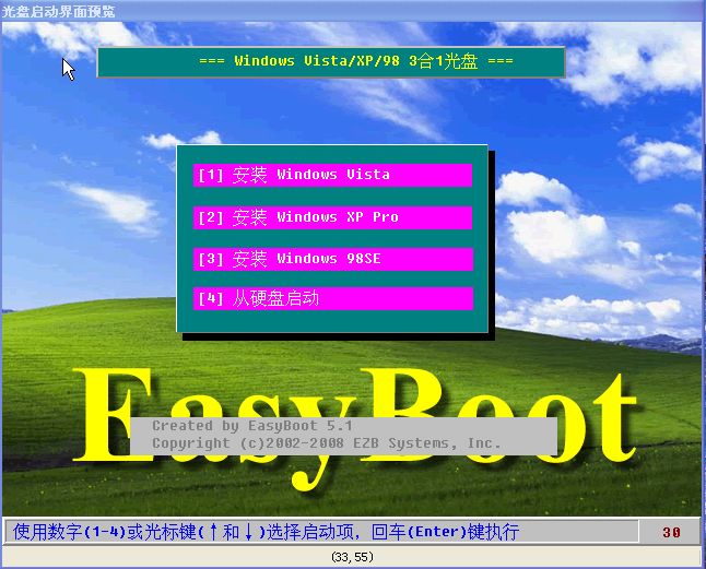 EasyBoot是一款集成化的中文光盘启动菜单制作工具,它可以制作光盘启动菜单、自动生成启动文件、并生成可启动ISO文件。只要通过CD-R/W刻录软件即可制作完全属于自己的启动光盘。