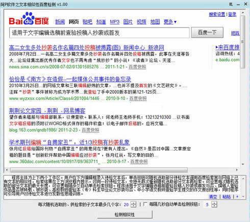 程序主体为上下两个工作区。用户在下方编辑框录入待检文本后,单击按钮可随机选取部分待检文本调用百度检索其与网络上已有文本的相似性,检索结果在上方浏览框内显示。对同一段待检文本,支持无数次重新随机选取部分文本再检索。可设置每次随机选取的部分文本的最大长度,可设置每隔多久自动单击检索按钮。借助本程序,文字编辑选稿前可查验投稿人抄袭或首发与否;撰稿人可查验作品是否发表,是否被转载、被抄袭;高校教师可查验本、专科生毕业论文抄袭与否;中小学语文教师可查验学生提交的作文原创性等,同时程序可引导用户对待检文本进行发散性思维训练。绿色免安装,完全免费