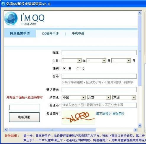 亿家QQ靓号申请器管家软件采用全自动自动提交方法,主要针对QQ申请,全自动宽带连接,Cookies清理等,做到了5秒申请一个QQ,功能强大,安全、方便。 占用内存低,打开软件后直接输入验证码即可,号码申请后会自动保存在MYQQ.txt 文本