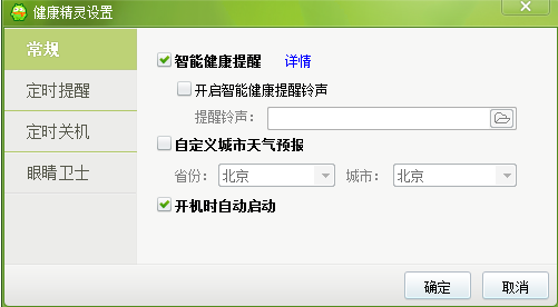 1、智能提醒:默认是开启状态,可设置关闭(提醒内容包括:安仔问候语、天气提醒、娱乐后休息提醒、节日提醒、自动关机、电脑清理提醒、系统盘不足提醒等)。
