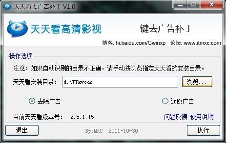 1、此补丁不能完全去除天天看软件的所有广告,不能去除首页的广告,不能去除滚动文字(去除也会显示乱码);