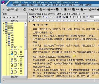 电子日记本是一款用于在电脑上写日记或收集文档的软件。支持常用的文字编辑排版功能,具有高强度的保密性。软件特点:# 全中文软件,使用方便,适合中国人习惯; # 界面清新漂亮,默认界面为仿 neoplanet 风格,支持换肤; # 采用登录方式,只有输入正确用户名和口令才能进入; # 一位帐户对应着一个日记文件,但根据需也可拥有多个日记文件;# 日记文件经过非常严格的加密,充分保护你的隐私; # 支持多用户,每位用户均有自己的设置,互不干扰; # 别致的快速隐藏功能,防止他人偷看; # 最小化锁定功能,在你暂时离开时防止他人乘机偷看你的日记; # 登录日志功能,察觉盗取口令者的非法访问;# 实用的附件功能,每一篇文档和日记都可添加附件; # 强大的打印和打印预览功能; # 完善的搜索功能,支持全局快速搜索