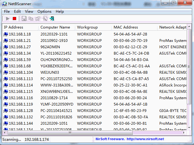 netbscanner是一个网络扫描工具,扫描所有的计算机的地址范围的选择,使用Net BIOS协议。每一台计算机位于此扫描器,显示下列信息:地址,计算机名称,工作组或域,地址,和公司生产的网络适配器(根据确定的地址)。netbscanner也显示电脑是否是一个主浏览器。你可以选择一个或多个计算机发现netbscanner,进而导出到文件列表/制表符分隔的文件/文件。
