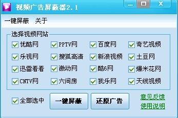 解压后双击屏蔽补丁即可屏蔽看看、优酷、百度、奇艺(根据反馈奇艺广告去除不完全)、CNTV、新浪视频、PPTV、乐视、搜狐高清、我乐网、6间房、土豆、酷6、激动网、天线网的广告。本程序安全小巧,操作简单,对于不想看片头广告的友友来说,是一个非常不错的选择。