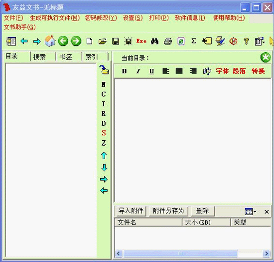 电子书制作利器-友益文书软件是一款集资料管理、电子图书制作、翻页电子书制作、多媒体课件管理等于一体的多功能软件…可用于管理htm网页、mht单一网页、word文档、excel文档、幻灯片、wps文件、pdf、chm、exe、txt、rtf、GIF、JPG、PNG、DJVU、ICO、TIF、BMP、Flash动画等格式的文件; 支持文本、网页、word文档的全文搜索,支持背景音乐播放;集成pdf阅读功能,不需要安装任何pdf阅读器,即可方便阅读pdf文件; 可方便制作翻页电子书;能生成具有全文搜索、目录搜索、收藏夹等功能chm格式文件;对所管理的资料可直接生成可执行文件,在任何计算机上阅读该软件采用视窗风格,目录树结构管理,所见即所得的设计理念,不需要复杂的转换、编译;使用,操作方便,可以自由地添加、删除目录树,可以随心所欲地编辑文档内容,改变字体大小和颜色。