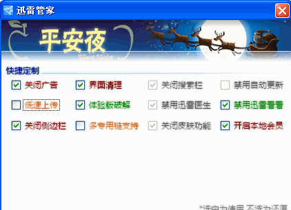 禁用迅雷医生和迅雷看看,关闭侧边栏,多专用链支持,关闭皮肤功能,开启本地会员!