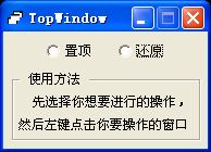 使用方法:运行软件,设置一下启动的热键(默认Ctrl+F8),最小化软件,打开要置顶的软件使其为当前的活动窗口然后按一下设置的热键就可以把窗口置顶了。软件退出后设置了置顶的窗口还会一直在最顶端的