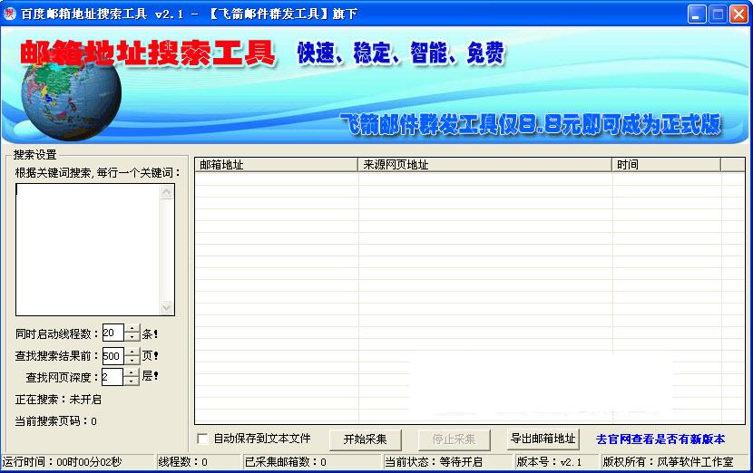 您的位置: 首页-> 下载分类-> 网络工具-> 邮件检测-> 百度邮箱地址搜索工具 2.2 中文绿色版