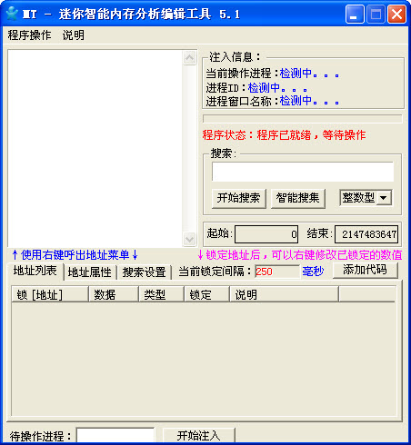在使用本程序前,请先 在程序最下方 写入要读写内存的程序进程名称,可在 任务管理器中查看。