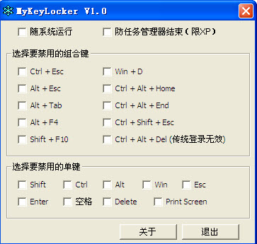功能:用于锁定系统常用热键,比如可以禁用alt+f4、alt+tab等系统快捷键。软件默认热键为ctrl+shift+0。若加/h参数则以后台方式运行本软件。