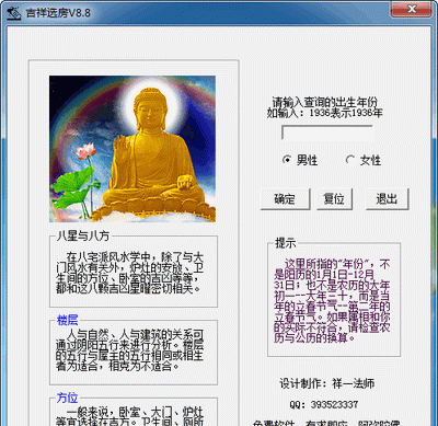 此软件依据先前智者积攒下来的理论制作。输入查询的出生年份,如输入1936表示1936年。就可以直接推算出是属于“东四命”还是“西四命”,同时显示建议楼层和方位,可以作为选房参考。本软件完全免费,无任何广告和限制。