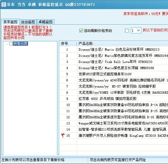 用来监测京东、当当、卓越的价格变化,自动刷新价格变动的小软件,打开软件后,双击左侧列表页可直接打开产品网址