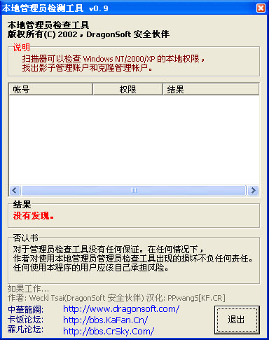 Local Permission Checker是一个检测本地是否有隐藏管理员的工具,专门检测系统中是否存在克隆帐号,用Local Permission Checker检测的结果中如果有被克隆的帐号会以红色显示出来,并且会有英文说明。