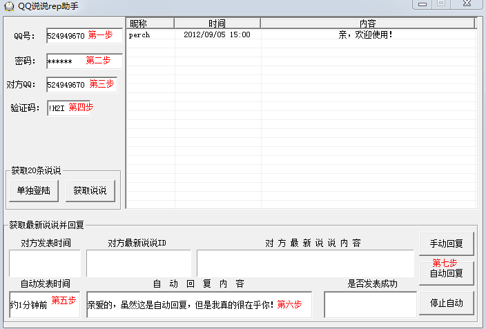 第七步自动回复,每隔30秒左右会检测对方的说说,如果“对方发表时间”和“自动发表时间”一样,那么就会发表你所设置的“自动回复内容”