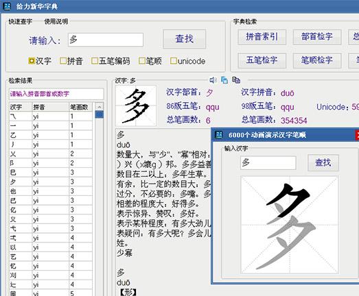 给力新华字典为免费软件,收录了gbk全部汉字21000多个。可离线查询汉字的拼音、部首、五笔、笔画、详细解释、例句、用法等;大部分汉字做了校对;其中五笔编码全部做了校对,每个汉字都提供86版五笔和98版五笔两种编码。本字典可提供多种检索方式,可按拼音索引,也可按部首、总笔画、五笔、笔顺检字;还提供了7000多个常用汉字的笔顺动画演示,是中小学生学习汉字的良好工具,可帮助初学者按正确的笔画顺序书写汉字。给力新华字典是给力成语词典的姊妹软件。