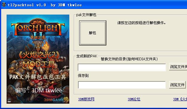 1.可按工具上方的解包按钮,按工具提示先选择需要解包的pak文件(原游戏只有一个,地址在 .\Torchlight 2\PAKS\DATA.PAK),然后再选择解出来的文件存放的位置;