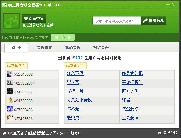 大家都喜欢玩转QQ空间,有时候进入了别人空间,听到一首非常喜欢的歌曲,那怎么办呢,这样就可以用到今天的这款软件了,名为傻瓜克隆空间背景音乐2012正式版它是一款可以将网络上的音乐,别人QQ空间背景音乐,免费添加到你的空间的一款克隆软件!对于你来说,TA的音乐,就是你的音乐,无需再受到官方收费的限制和找音乐的烦恼。只需一键,全部免费搞定!