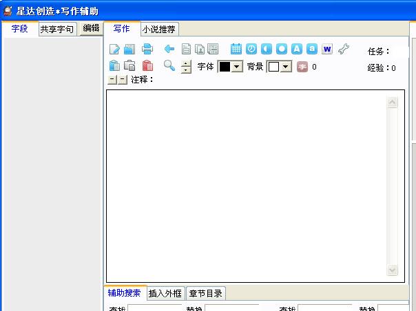星达写作主要针对txt文本写作小说时候应用的一些便捷功能加强,使得写作小说的创作者可以通过快捷写作来应付每日的写作任务,工具提供了任务功能,可以自己设定自己每次的写作字数任务,完成任务会提醒,工具也提供了字段插入,字段注解,给创作人员提供了写作以及查询资料的便捷性,工具还提供了目录章节功能,可跟看小说一般的随意查询自己的文档等。