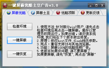 1.使用方法:针对部分win7用户,请先点击检查环境后再点击一键屏蔽。最好以管理员权限运行,如果出错,请反馈系统