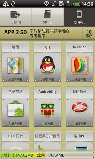 App 2 SD能够找到系统上的应用,并轻松移动到sd卡上,很显然看到这个软件的名字App 2 SD就知道是干啥用的,一款能够找到Android系统上的应用程序,并把它轻松移动到sd卡上,从而帮助您获得更多的宝贵机身空间,适用于Android 2.2版本及更高版本!