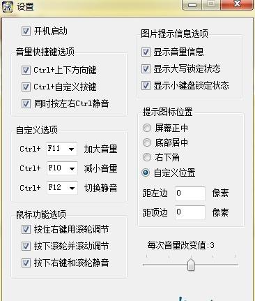 音量快捷键助手允许你使用快捷键来调节系统音量,这比起系统默认的控制方式要方便很多。音量快捷键助手默认采用ctrl + 箭头来控制系统音量的大小或静音,当然,你完全可以根据自己身习惯来自定义这些快捷键。当音量被调节时,屏幕会以图形界面方式显示音量的变化信息。软件还提供了鼠标右键加滚轮来控制音量的快捷方法,比如你可以按住鼠标右键用滚轮调节系统音量大小,而同按住鼠标滚轮和右键即可静音,很是方便!由于软件基于.net开发,所以系统需要安装.net 4.0方可使用