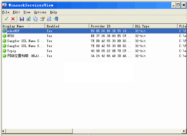 WinsockServicesView 将显示在您的系统上安装的所有 Winsock 服务供应商的详细信息。详细信息包括显示名称、 状态、 DLL 类型、 DLL 文件名、 DLL 说明/版本和创建/修改时间