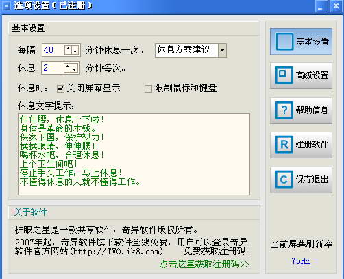 本软件可以定时提示电脑爱好者要注意休息,从而达到保护视力的目的,是电脑使用者的最佳护眼伴侣!