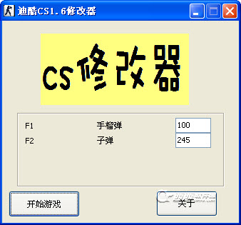 迪酷CS1.6修改器是一款针对迪酷CS版本的迪酷cs1.6作弊器,该作弊器只适合单机时候的玩。该作弊器可以将手榴弹数量设定为一个指定的值,将子弹数量修改为一个指定的指。手榴弹的修改功能,需要角色身上至少带有一个手榴弹,否则买不到,还需要必须死一次才可以。