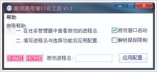 使用方法:运行游戏后,在任务管理器中查看游戏的进程名,然后填写到软件中去,选择好窗口化功能,点击应用配置,重新开启游戏即可窗口化进入.