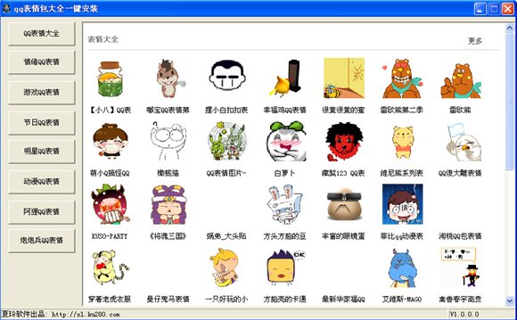 qq表情包管家1.0是国内首创的以qq表情为集合的软件,专门为喜爱qq表情的用户设计,软件绿色操作简单,一键可安装,使用方法傻瓜式操作。容纳表情数百种qq表情安装包,分为表情qq大全、情绪qq表情、节日qq表情、游戏qq表情、明星qq表情、动漫qq表情、搞笑qq表情、阿狸qq表情、炮炮兵qq表情等