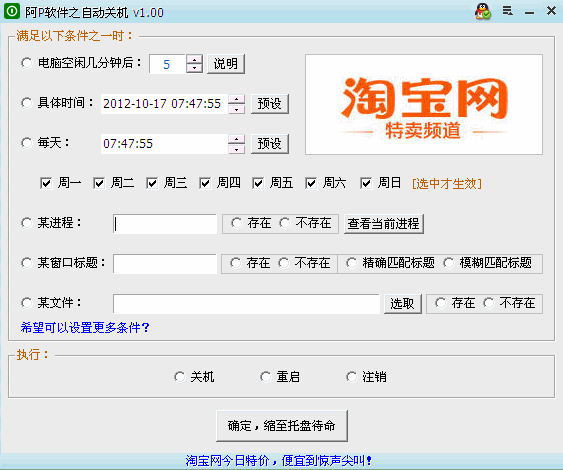 在满足您设置的条件时,自动关机、重启或注销电脑。可设置电脑空闲几分钟后、某具体时间、每天几时几分几秒(可排除周几)、某进程存在或不存在、某窗口标题存在或不存在(可选精确匹配或模糊匹配)、某文件存在或不存在时执行关机、重启或注销电脑。程序不写注册表,绿色免安装。