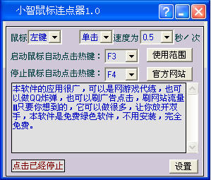 小智鼠标连点器是一款很有用的免费小软件,如果你在平时的游戏或是工作中经常需要大量点击鼠标左键或右键,如果你喜欢玩网络游戏,RPG游戏,那么一定有大量点击鼠标的经验,非常浪费时间,浪费精力,消耗鼠标!这个小软件可以解放你的手指啦!只要按下热键,让鼠标自动点击器帮你点击吧!鼠标点击速度可以调节,鼠标左键右键也可以选择。