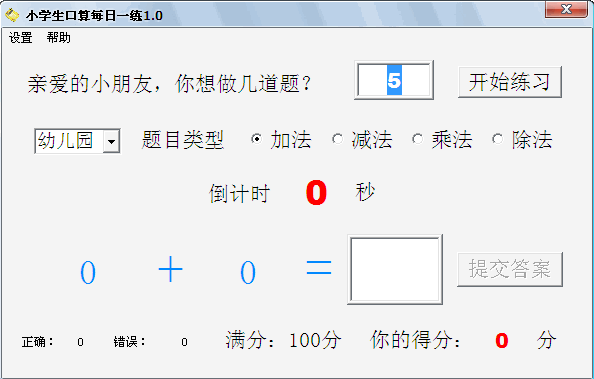 爱易小学生口算每日一练1.2 更新版本正式发布。本软件可以用于3-10岁小朋友口算训练使用。软件的功能包括:加法训练、减法训练、乘法训练、除法训练。软件可以设置题目难度、题目数量、答题时间等信息。